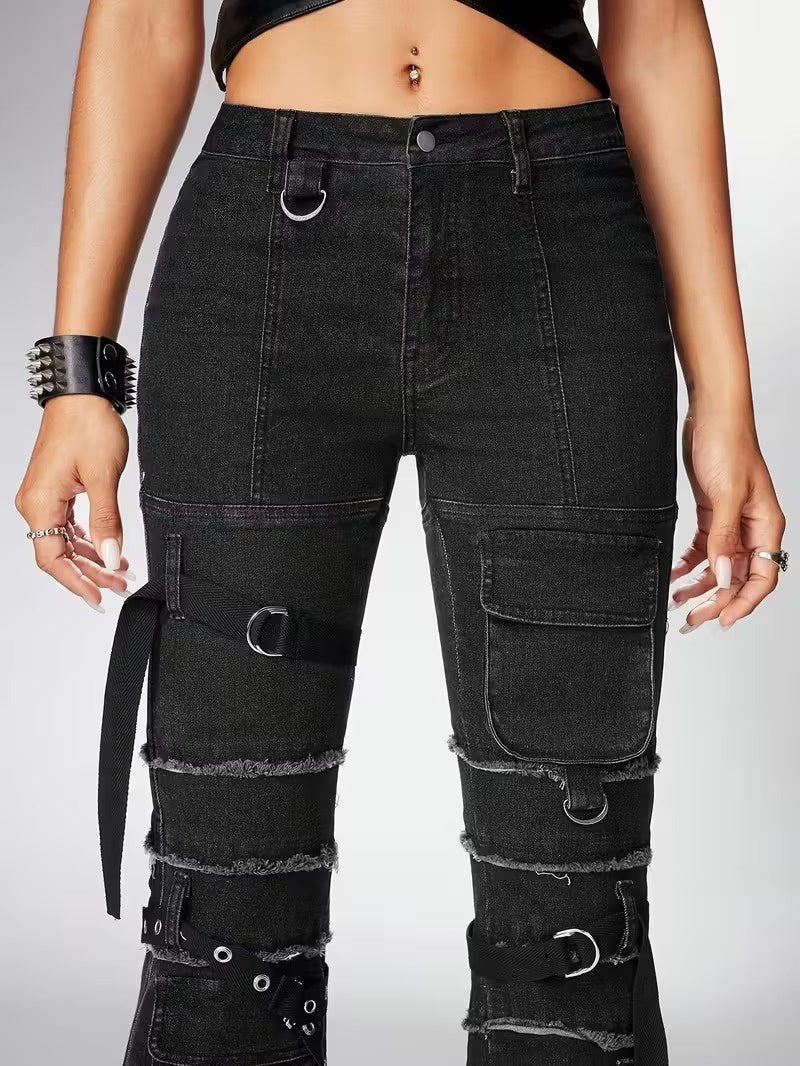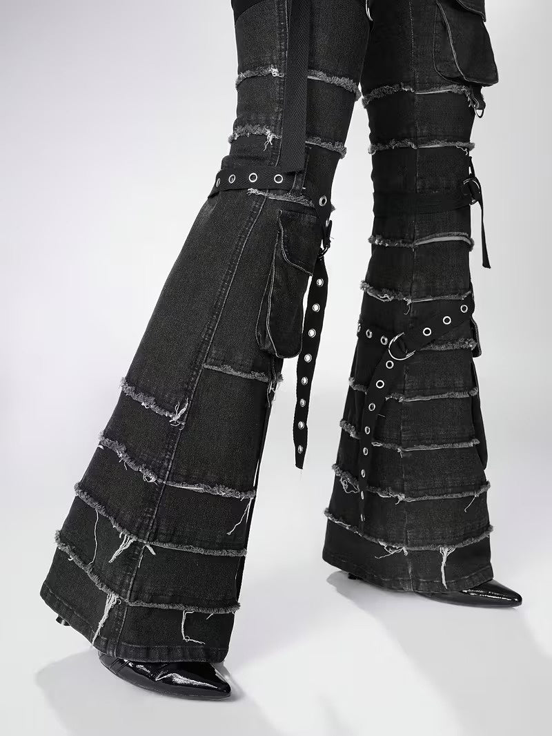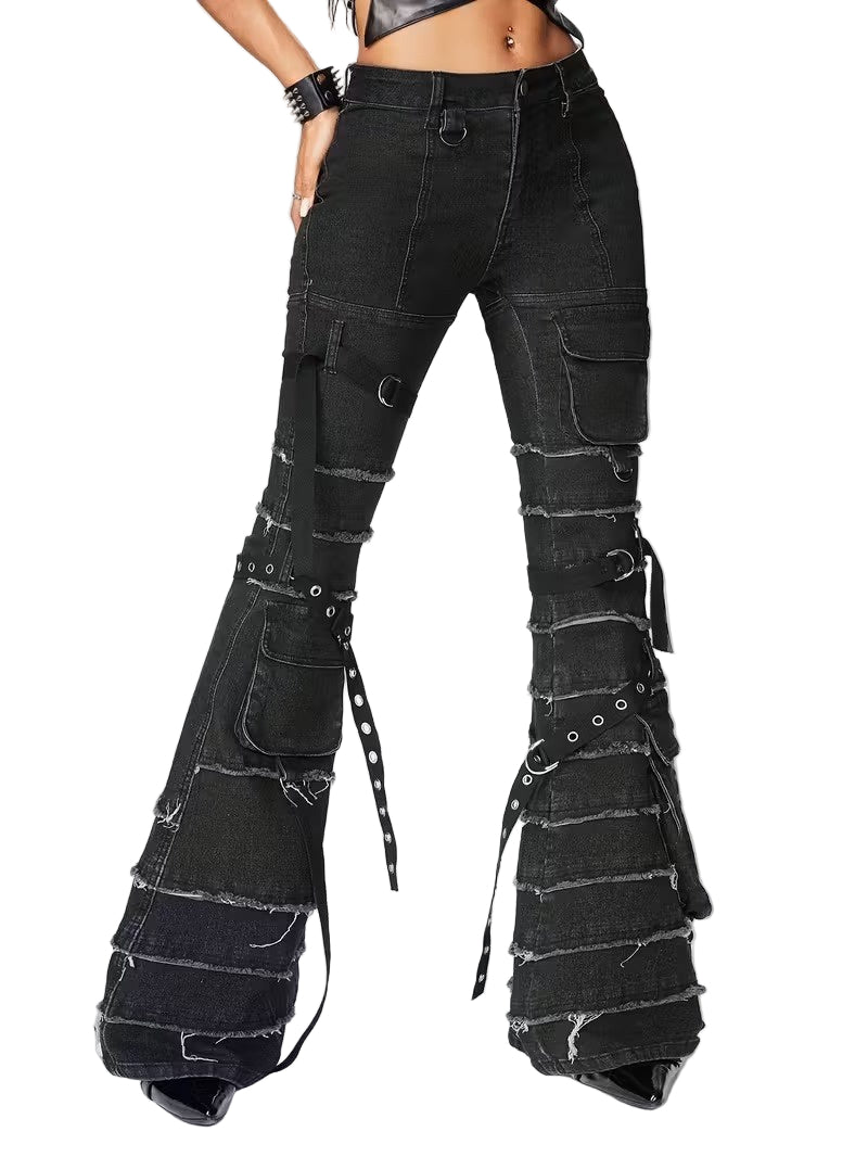 Te damskie spodnie mają dopasowaną górną część i rozszerzaną nogawkę. Spodnie mają kieszenie w stylu cargo na udach oraz kilka pasków z pierścieniami i klamrami. Dolna część nogawki składa się z kilku poziomych segmentów, których krawędzie są postrzępione.