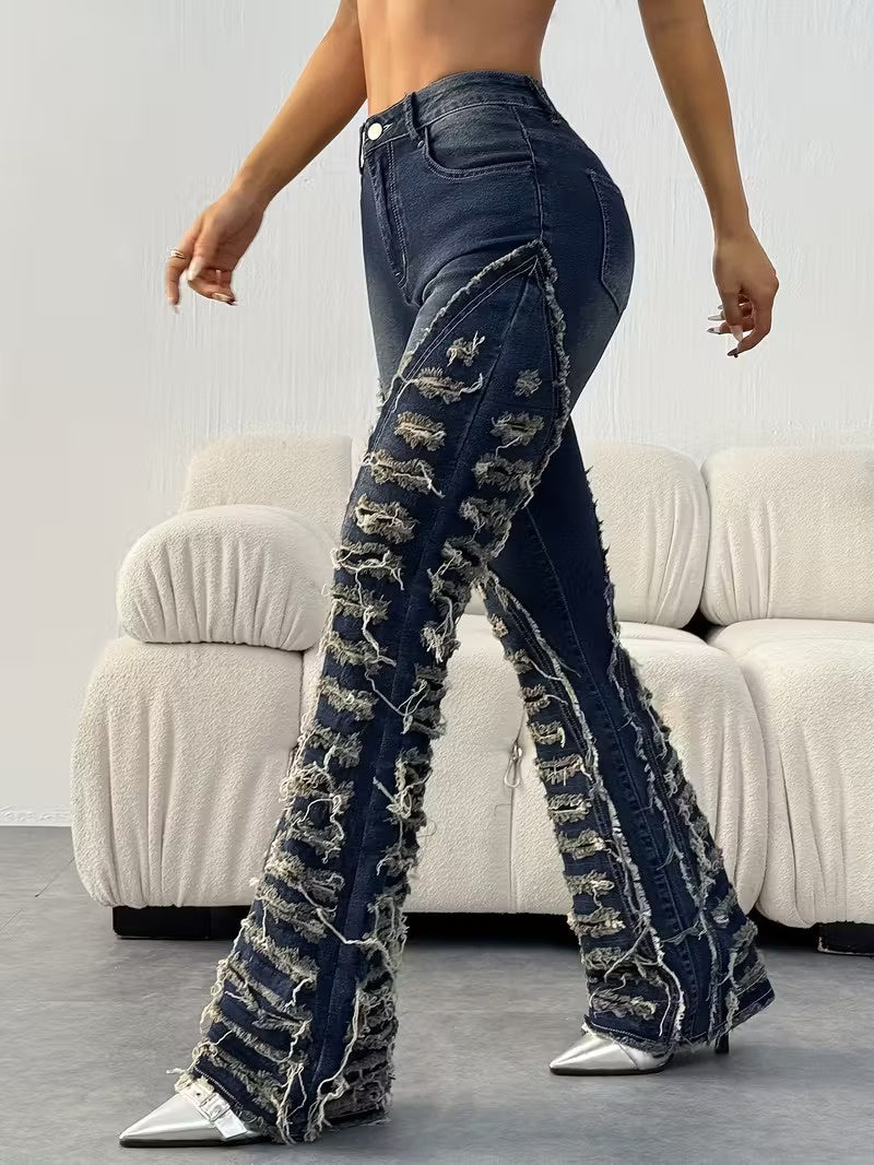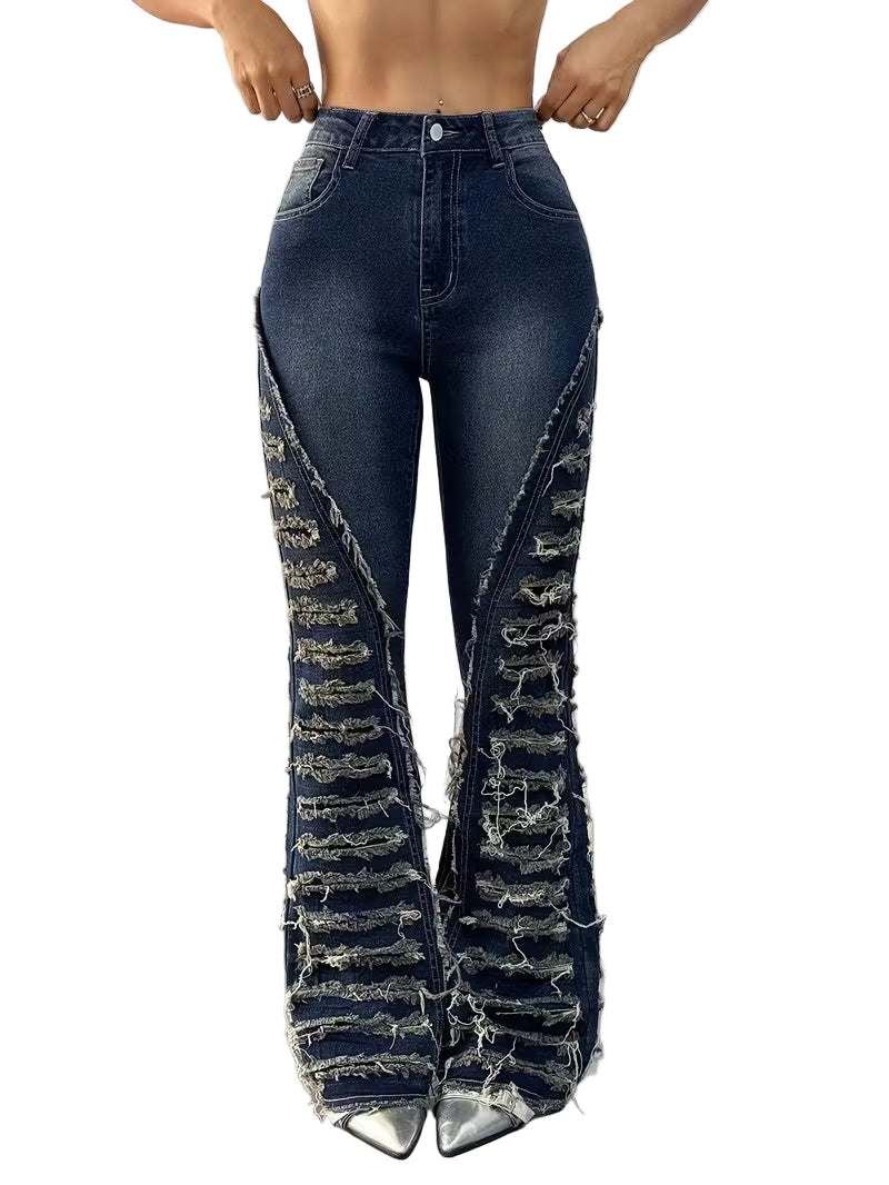 Te damskie spodnie mają wysoki stan i rozszerzany krój, który zaczyna się w okolicach kolan i poszerza ku dołowi. Przód, boki i tył nogawek są pokryte poziomymi, postrzępionymi paskami biegnącymi od górnej części uda do dołu nogawki. Spodnie mają kieszenie zarówno z przodu, jak i z tyłu.