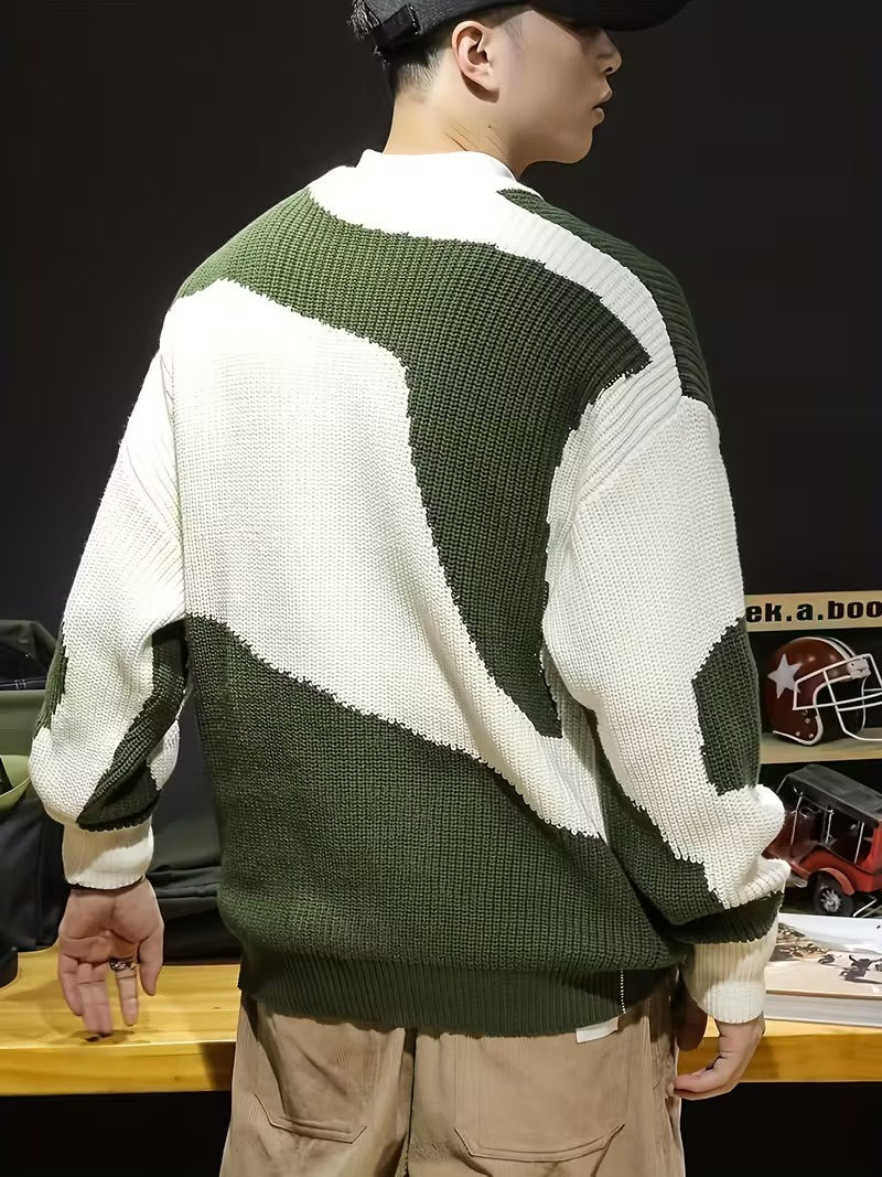 - Wzór: Abstrakcyjny, kontrastowy wzór rozmieszczony na całym swetrze.
