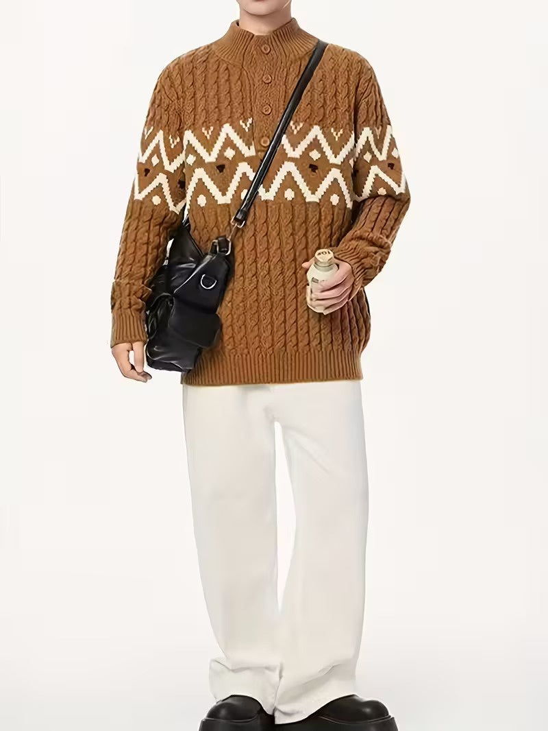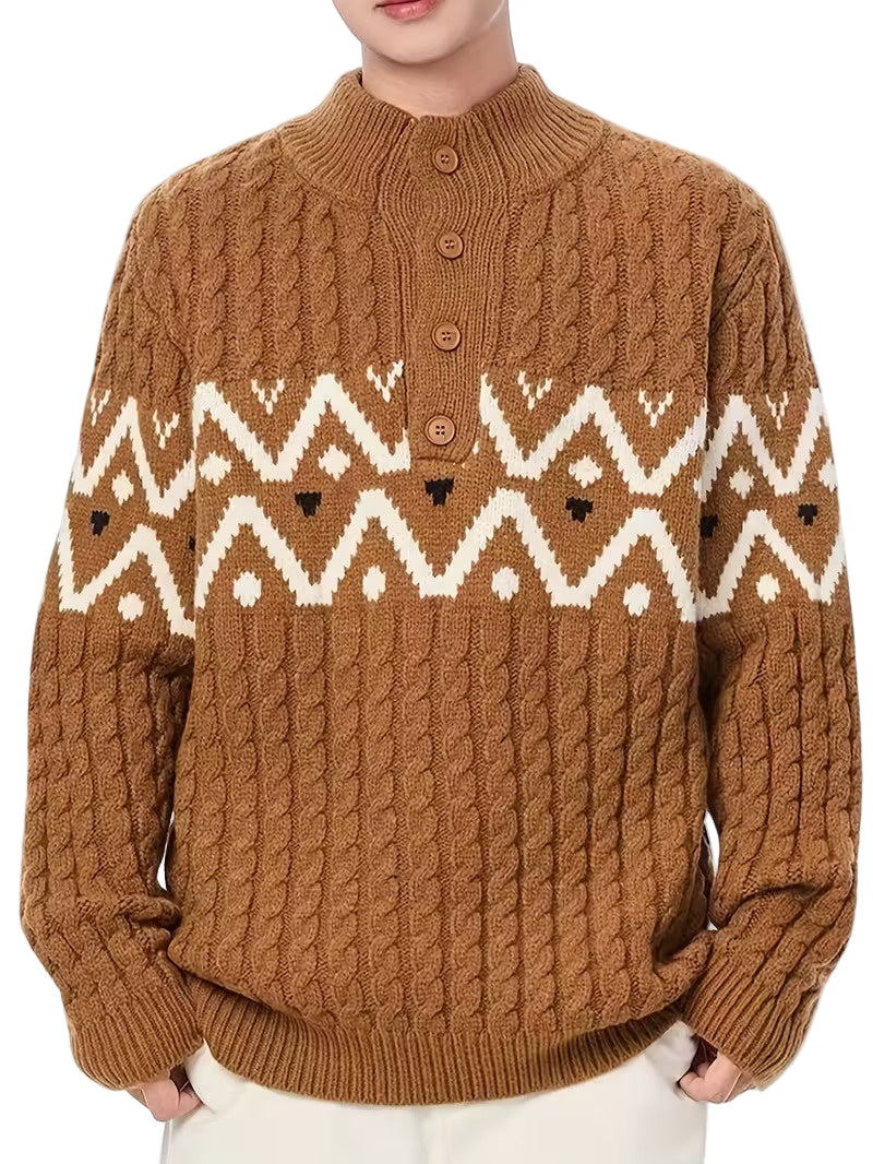 Ten męski sweter z długim rękawem ma kołnierz typu półgolf z zapięciem na guziki z przodu. Korpus i rękawy mają pionowy, teksturowany wzór.