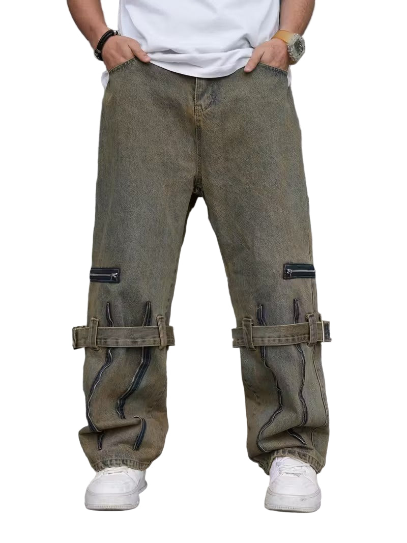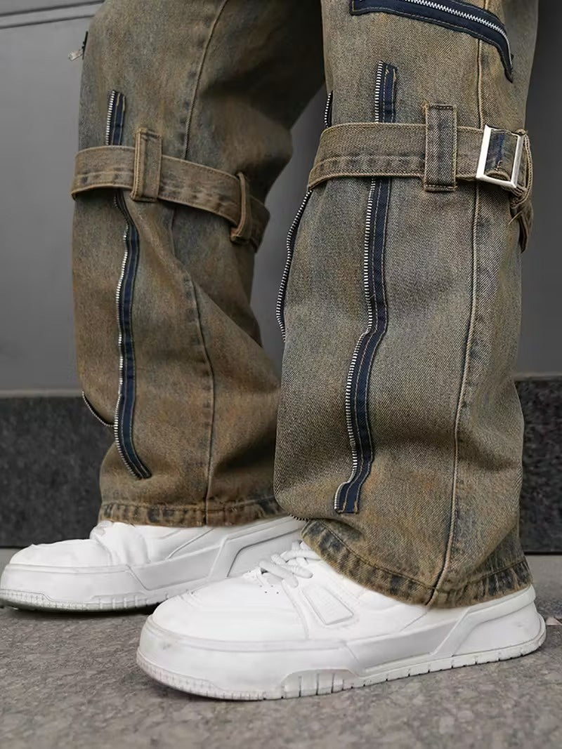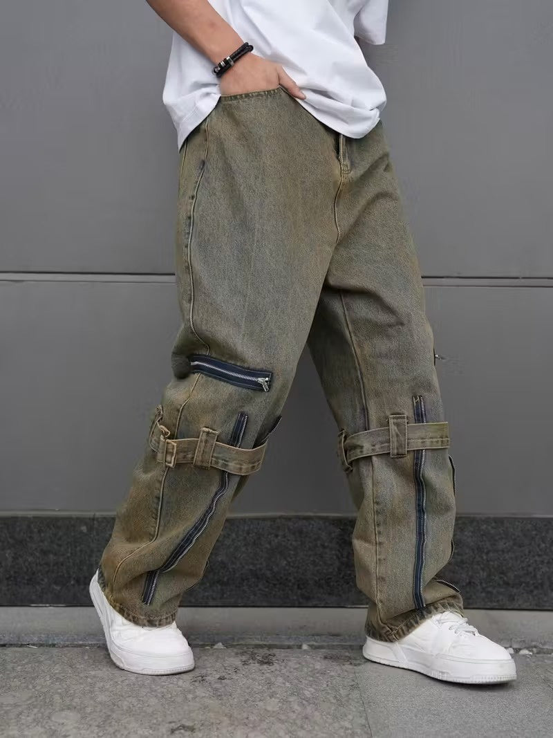 Męskie Spodnie z Szeroką Nogawką i Zamkami